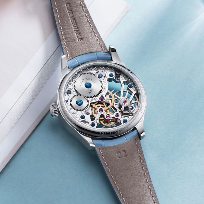 Zur edlen Erscheinung der Renaissance Skeleton Lady passend wurden die Zeiger in Blau gewählt. Ein türkises Lederarmband unterstreicht den Auftritt der bis ins Detail gepflegten Damenuhr.
