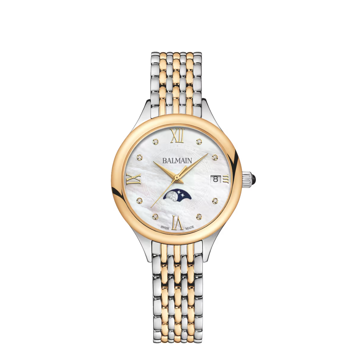 Die Balmain de Balmain ist eine elegante Damenuhr, die strahlenden Stil mit einem modernen, von der Pariser Haute Couture inspirierten Design verbindet. Das Zifferblatt aus weißem Perlmutt in der Mondphase, das mit 8 Top Wesselton VS-SI-Diamanten von insgesamt 0,030 Karat und klassischen römischen Ziffern besetzt ist, sorgt für einen sanften Touch, während das 31 mm große Bicolor-Gehäuse aus Edelstahl und Gelbgold mit PVD-Beschichtung mit einem raffinierten 7,65-mm-Profil und passendem Armband für alltägliche Raffinesse sorgt. Dieser Zeitmesser aus der Swiss Made ist mit einem Saphirglas ausgestattet.