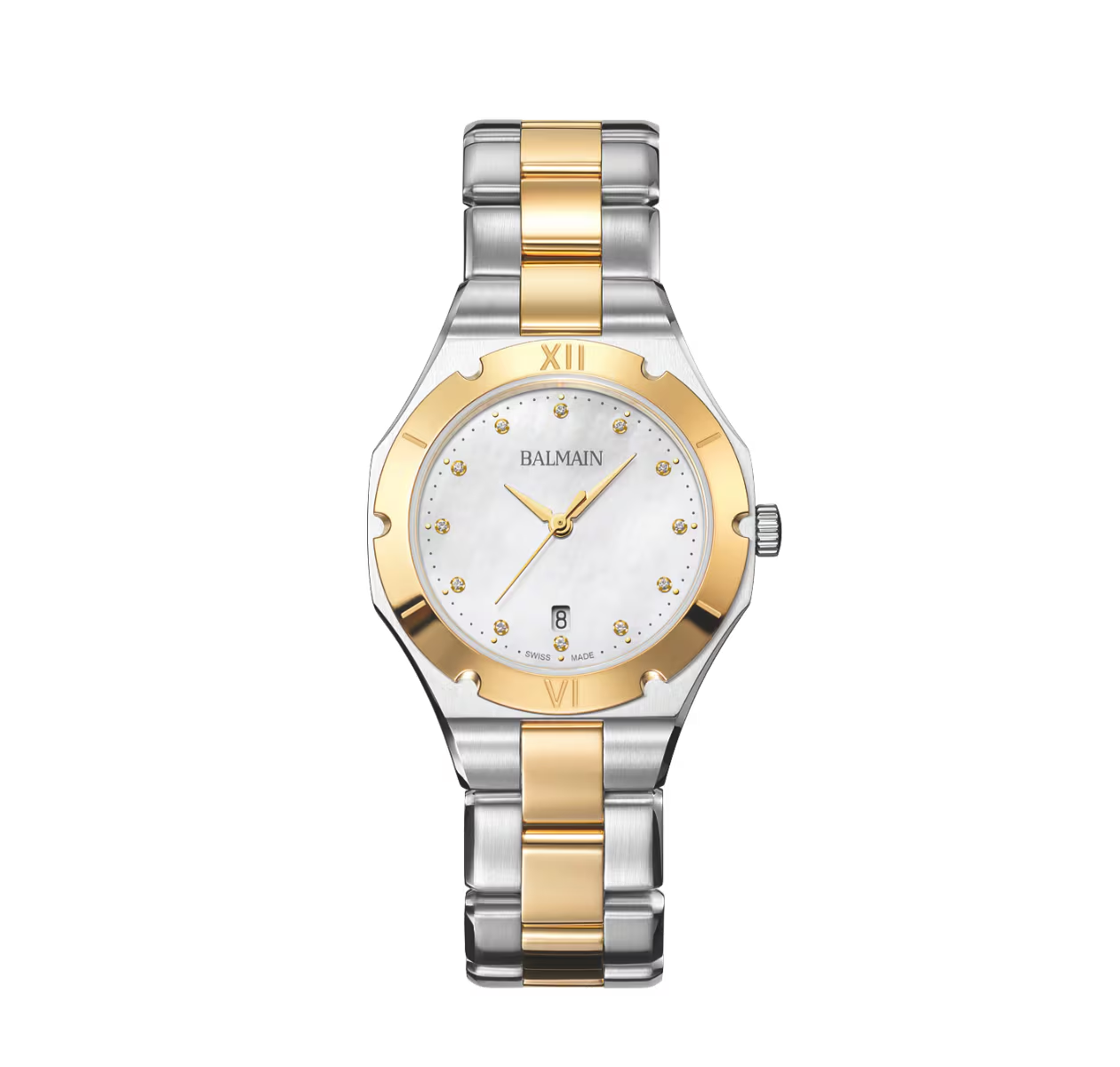 Die Balmain Be Balmain ist eine elegante Damenuhr, die kühnen Charme mit einem modernen Design verbindet, das von der Pariser Haute Couture inspiriert ist. Das Zifferblatt aus weißem Perlmutt ist mit 12 Top Wesselton VS-SI Diamanten von insgesamt 0,043 Karat besetzt und zeigt Diamantziffern. Das 31 mm große Bicolor-Gehäuse aus Edelstahl und Gelbgold mit PVD-Beschichtung mit einem schlanken Profil von 7,65 mm und dem passenden Armband bietet zeitlosen Stil für jeden Tag. Dieser Zeitmesser aus der Swiss Made ist mit einem Saphirglas ausgestattet.