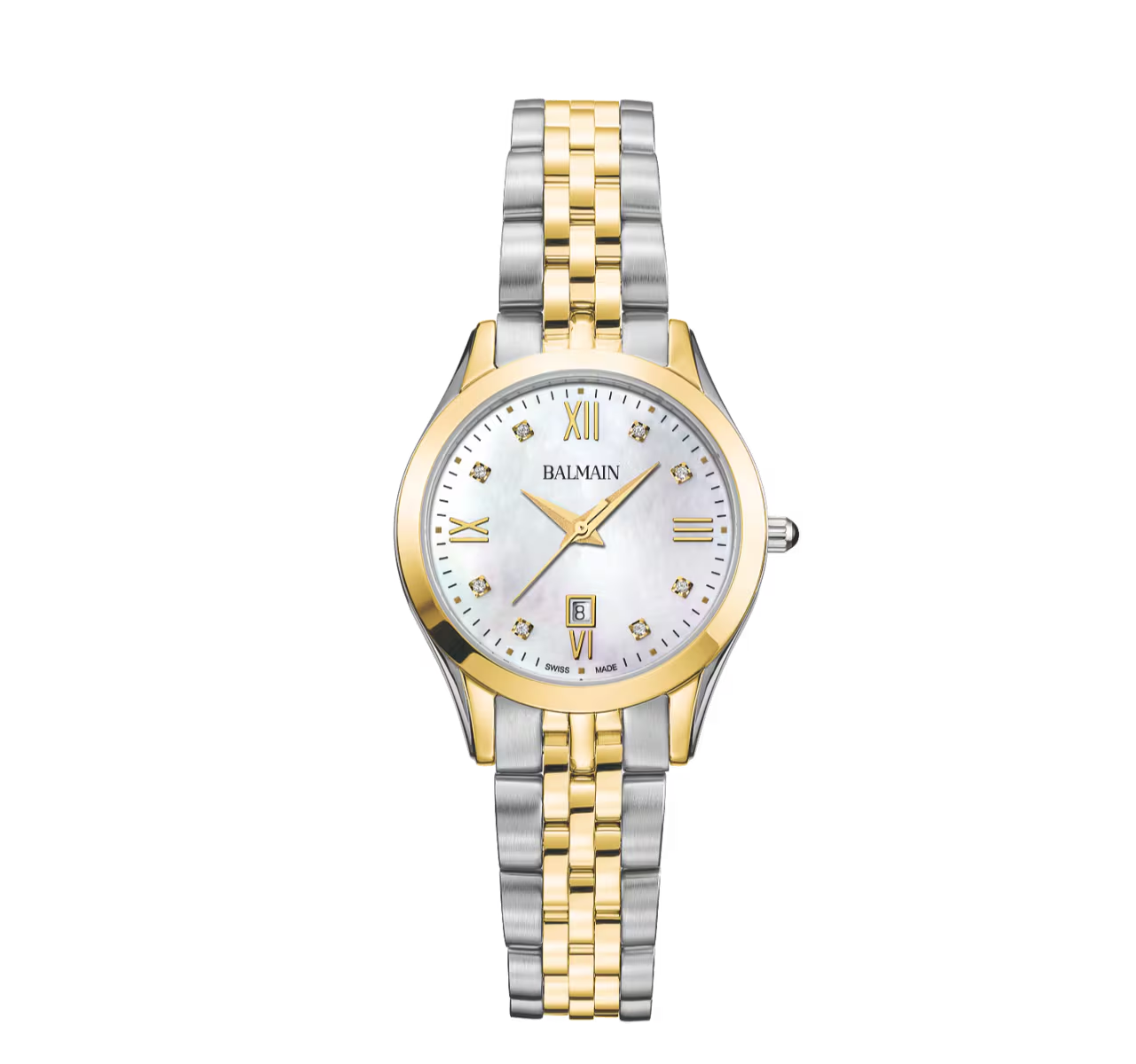 Die Balmain Classic R ist eine elegante Damenuhr, die künstlerischen Geist mit einem modernen Design verbindet, das von der Pariser Haute Couture inspiriert ist. Das Zifferblatt aus weißem Perlmutt, das mit acht Top Wesselton VS-SI-Diamanten von insgesamt 0,030 Karat und klassischen römischen Ziffern besetzt ist, sorgt für einen lebendigen Touch, während das 30-mm-Gehäuse aus zweifarbigem Edelstahl und Gelbgold mit PVD-Beschichtung mit seinem anmutigen 6,50-mm-Profil und dem passenden Armband für alltägliche Raffinesse sorgt. Dieser Zeitmesser aus der Swiss Made ist mit einem Saphirglas ausgestattet.