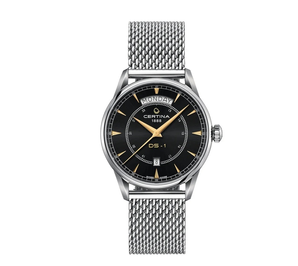 Bei der DS-1 Day-Date kommt jeder Tag gross raus: In einem geschwungenen Fenster bei 12 Uhr ist der Wochentag abzulesen, dessen Anzeige von einem Datumsfenster ergänzt wird. Elegante Dauphine-Zeiger und gewölbtes Saphirglas verleihen der Uhr mit dem hochwertigen Automatikwerk edlen Retro-Charakter.
