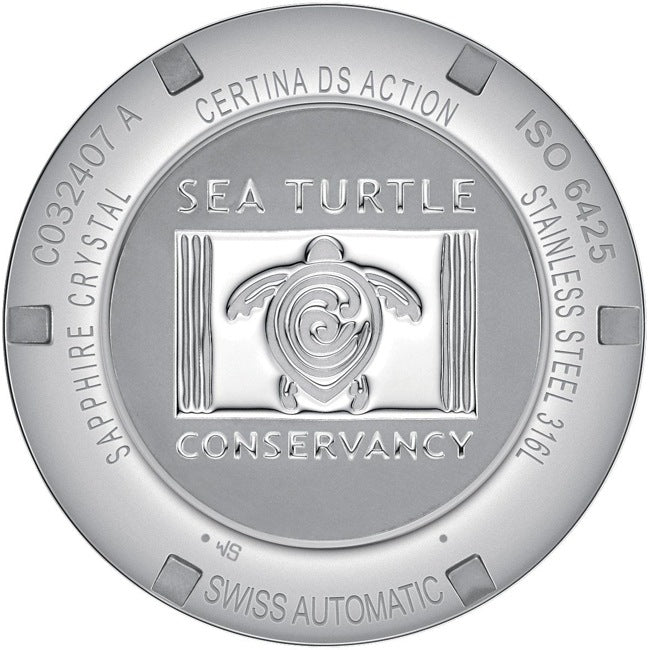 Diese Certina Special Edition würdigt die Partnerschaft von Certina mit der Organisation Sea Turtle Conservancy, die sich für den Schutz von Meeresschildkröten und deren Lebensräume einsetzt. Wasser und Action passen einfach gut zusammen. Das gilt auch für präzise Schweizer Uhrmacherkunst – vor allem, wenn sie mit dem bewährten Prinzip der doppelten Sicherheit versehen ist. Die CERTINA DS Action Diver beweist dies seit mehreren Jahren äusserst erfolgreich und erfüllt mühelos die strenge ISO-Norm 6425 für Taucheruhren. Ihre jüngste Neuauflage geht sogar noch über diese hohen Anforderungen hinaus: Mit einer Wasserdichtigkeit bis zu 300 Meter und dem innovativen Powermatic-80-Werk verspricht sie höchste Präzision auch unter der Wasseroberfläche. Egal ob Surfen, Schnorcheln oder Tauchen im Korallenriff – im kühlen Nass sind Sportler in ihrem Element. Sie alle schätzen die Begleitung einer Armbanduhr, die auch unter Wasser präzise Leistung abliefert. Als erprobte Taucheruhr wird die neue CERTINA DS Action Diver allen Anforderungen der anspruchsvollen ISO-Norm 6425 gerecht. Mit ihrem automatischen Powermatic-80-Kaliber bietet sie zudem eine Gangreserve von bis zu 80 Stunden und ist so auch einsatzbereit, wenn die perfekte Welle etwas länger auf sich warten lässt. Maritime Zeitmesser sind seit Langem fester Bestandteil der CERTINA Kollektion. Die DS Action Diver verleiht ihnen ein so sportliches wie modernes Gesicht: Ihr satiniertes Edelstahlgehäuse von 43 mm Durchmesser ist mit einer äusserst griffigen, einseitig drehbaren Lünette aus schwarzem eloxiertem Aluminium versehen. Dank einer geschützten Super-LumiNova®-Markierung kann damit auch in Dunkelheit die Tauchzeit abgelesen werden. Der blaue Sekundenzeiger ist ein Verweis auf die Organisation Sea Turtle Conservancy, deren offizielles Logo auf dem Gehäuseboden zu sehen ist.