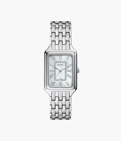 Die rechteckige Raquel ist eine Ikone aus unseren Archiven, die für die heutige Zeit modern neu aufgelegt wurde. Die flache, vielseitige Uhr hat ein 3-Zeiger-Werk mit Datumsanzeige und ein Perlmuttzifferblatt mit Glitz-Rahmen. Dazu gehört ein siebengliedriges Edelstahlband mit gebürsteten und polierten Gliedern.
