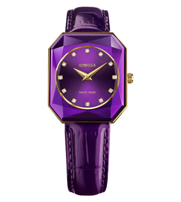 Diese elegante Damenuhr mit lila Lederband gibt es kein zweites Mal. Das Modell aus der neuen Facet Radiant Kollektion sticht durch sein unverwechselbares, rechteckiges Gehäuse mit abgerundeten Ecken heraus. Der Radiantschliff, die Goldapplikationen und Strass-Indexe sorgen für ein hypnotisierendes Funkeln
